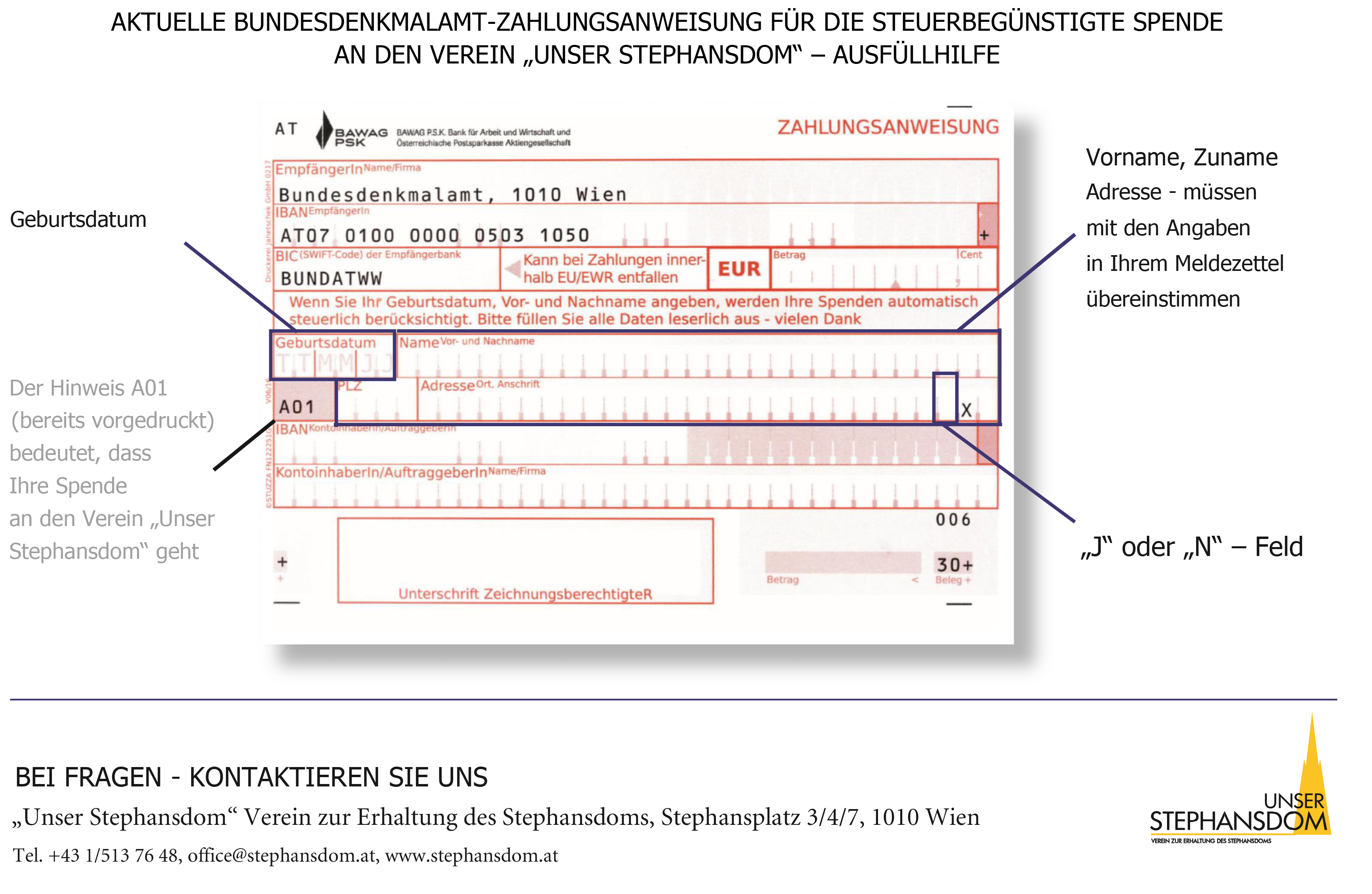 Wenn Sie Ihre Spende steuerlich geltend machen wollen, ist dies über das Treuhandkonto des Vereins "Unser Stephansdom" möglich.